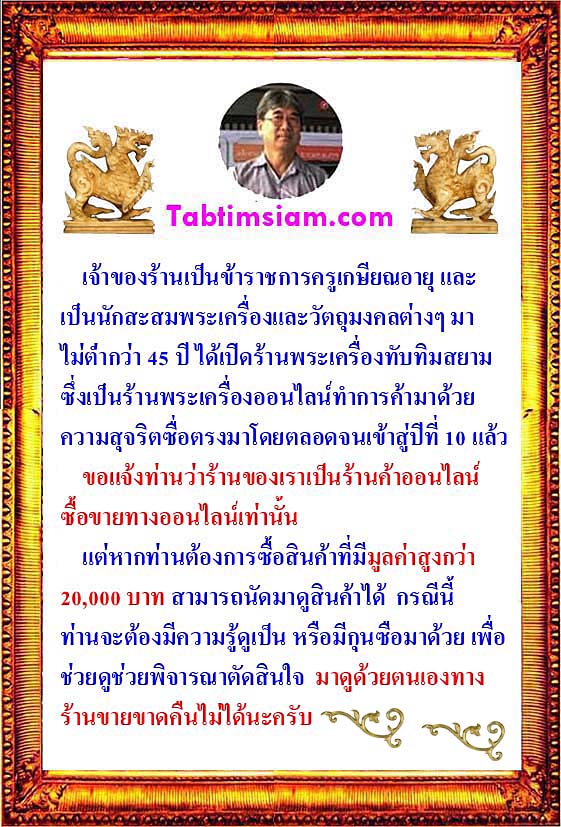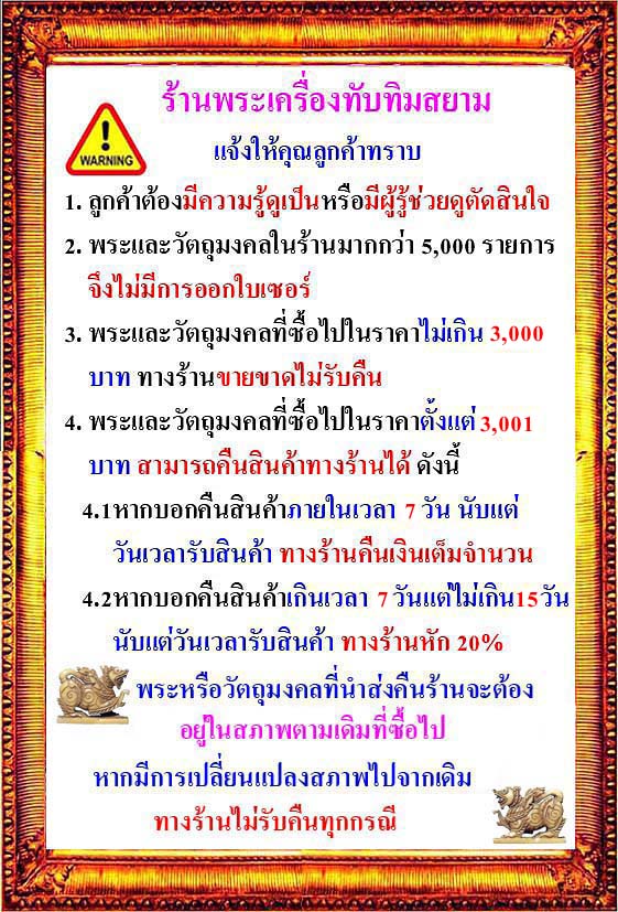 ร้านพระเครื่องทับทิมสยามดำเนินงานโดยนักสะสมพระเครื่องที่ได้สะสมมานานกว่า 40 ปีโดยการศึกษาหาข้อมูลด้วยตนเองมิใช่เซียนในสนามพระใหญ่ๆไม่ว่าจะเป็นสนามใด ดังนั้นคุณลูกค้าจึงมีหน้าที่หลักที่ต้องตรวจสอบ หากประสบพบปัญหาใดก็ตามสามารถคืนสินค้าได้ในเวลาที่กำหนด…